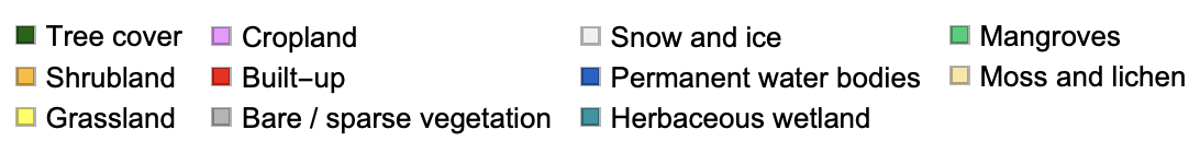 ESA WorldCover classifies land cover using the following eleven land cover classes:
