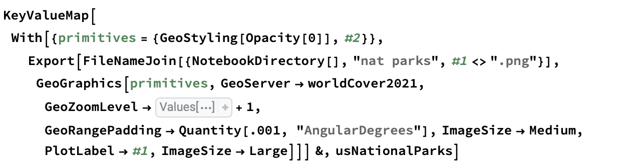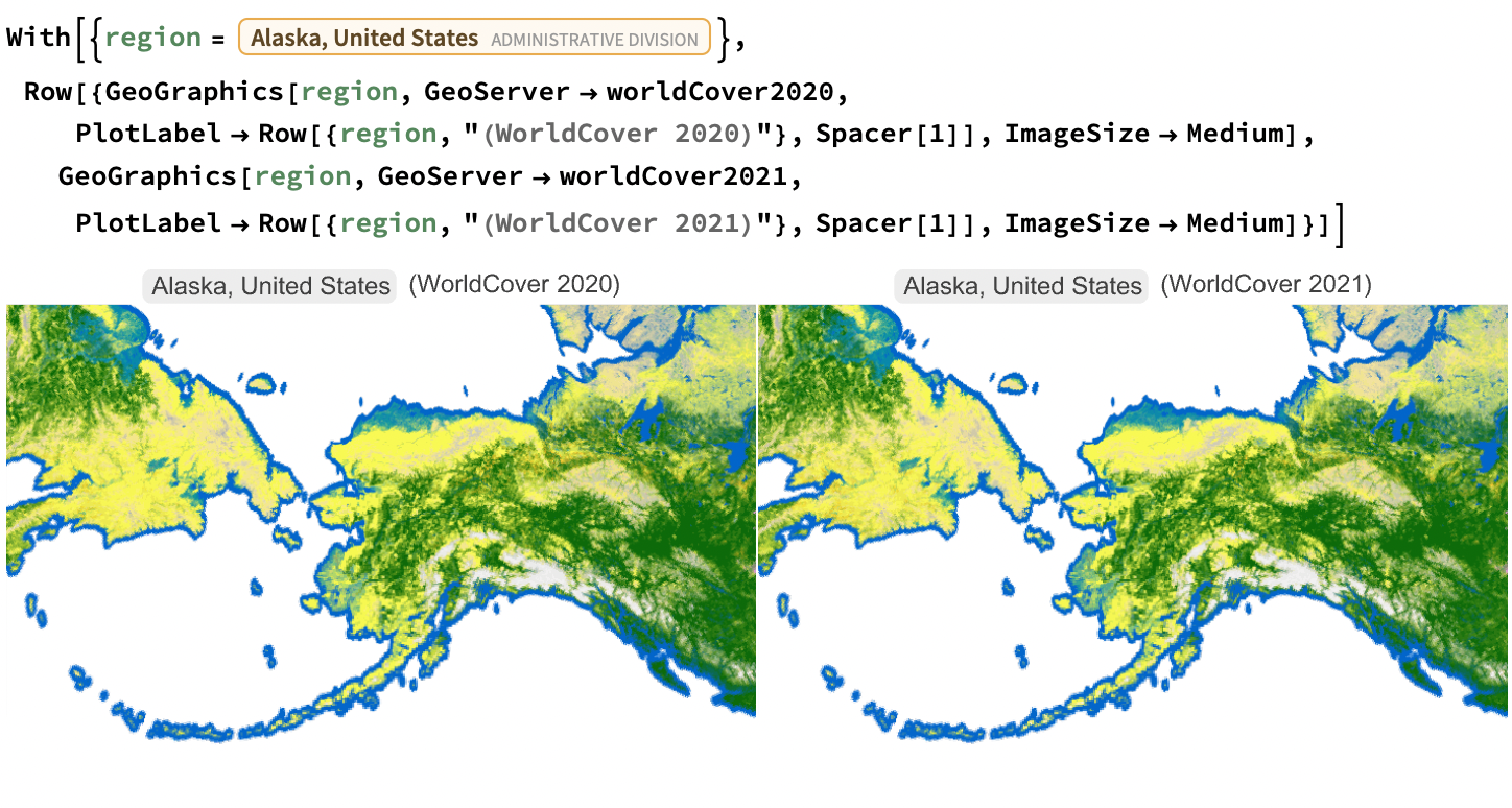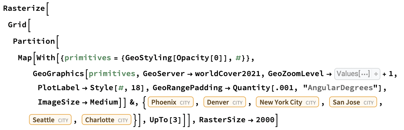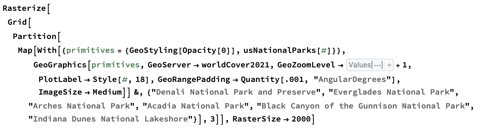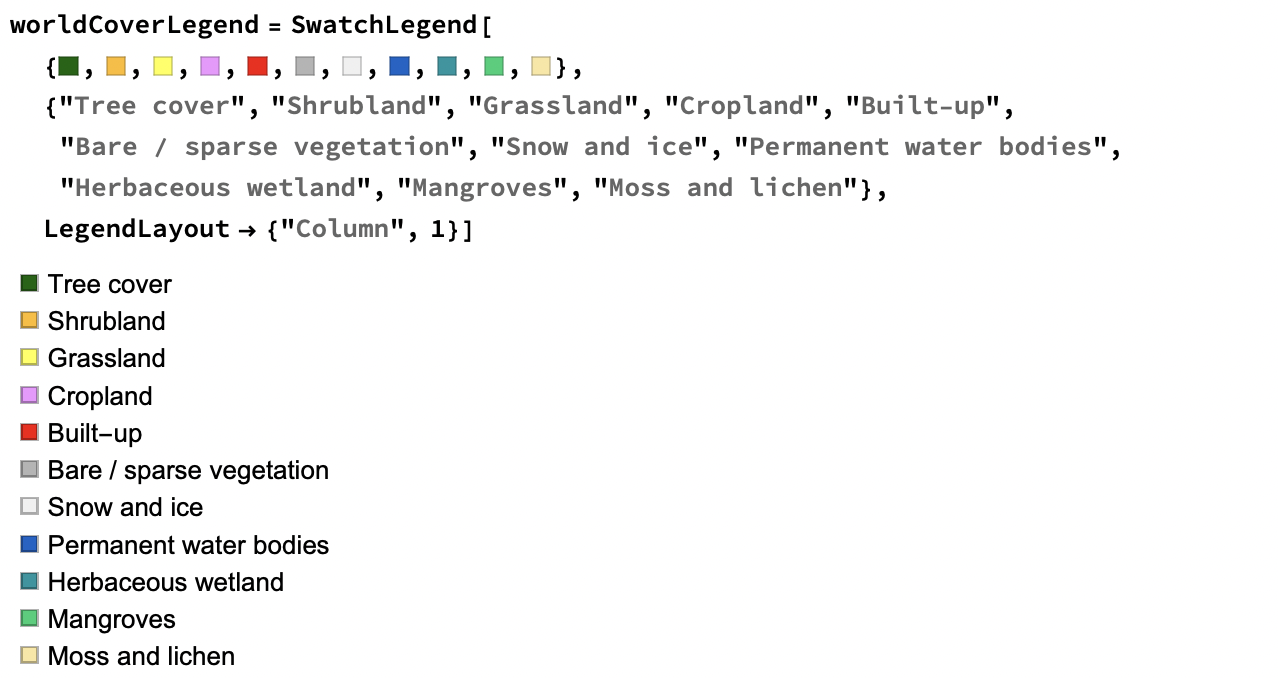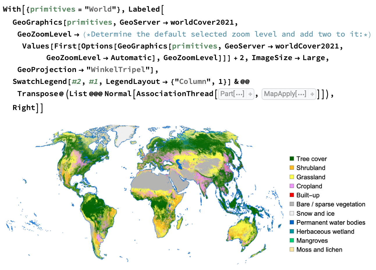 This short piece will demonstrate how to connect to ESA WorldCover to make custom geographic visualisations in WL, and illustrate the flexibility of the Wolfram environment for this kind of data exploration by visualizing the land cover around the twenty largest US cities by population size, and around the 63 US national parks. The code to generate the former set of maps will be about five lines long, and about twenty lines long for the latter.