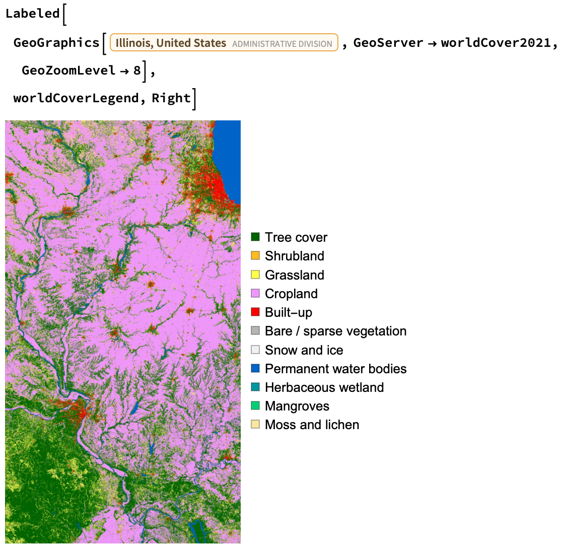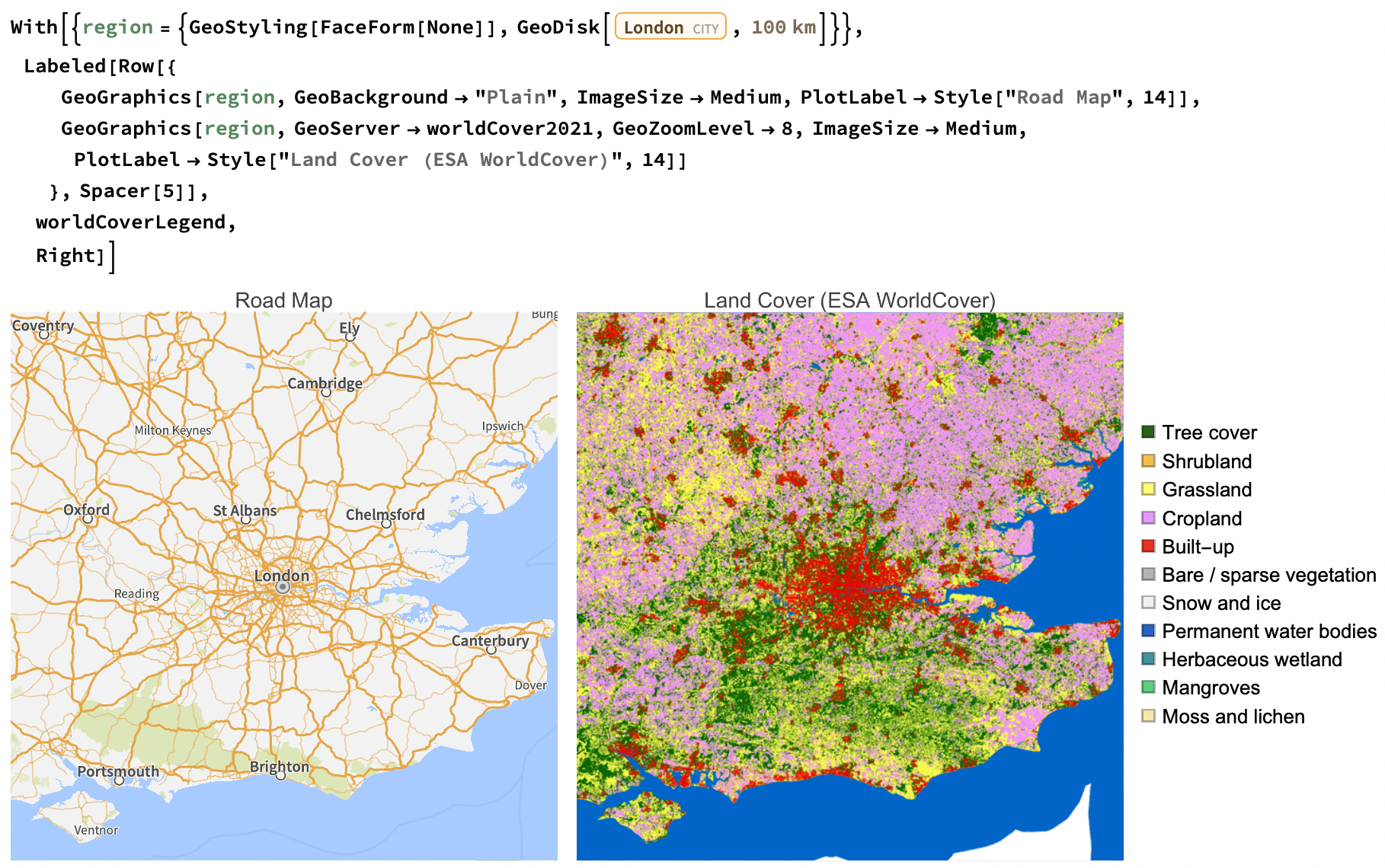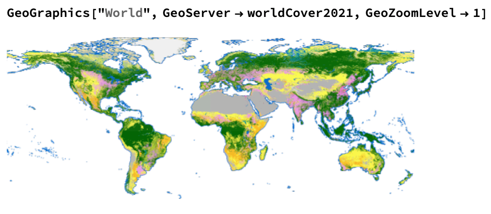 In Wolfram Language (WL), it's fairly straightforward to access ESA WorldCover data through GeoGraphics using the GeoServer option. This way, we can visualize land cover for any region on Earth, from small scale features like countryside human settlements to entire continents, and compare it to other geographic data to uncover patterns in land use and other anthropogenic environmental impacts.