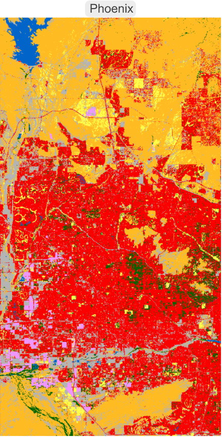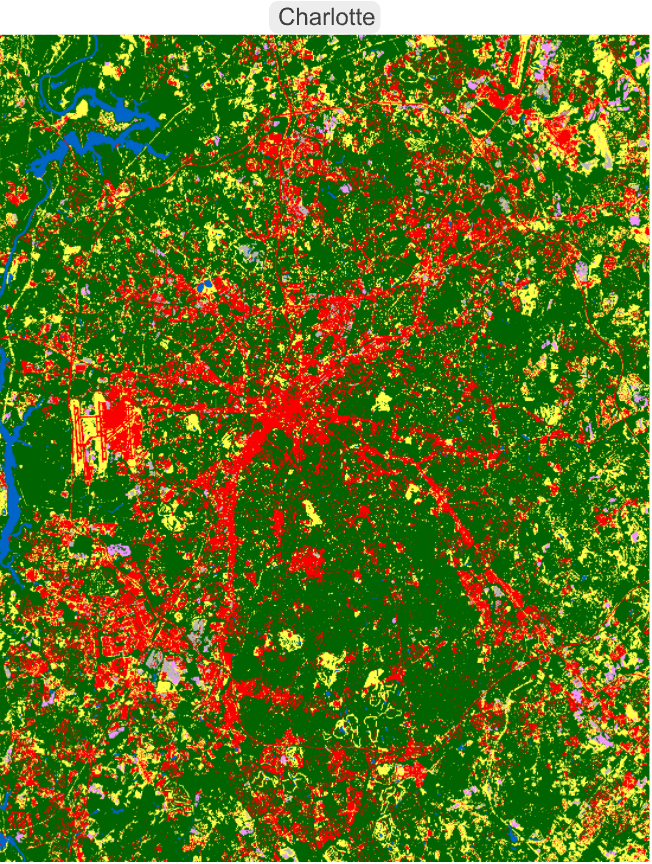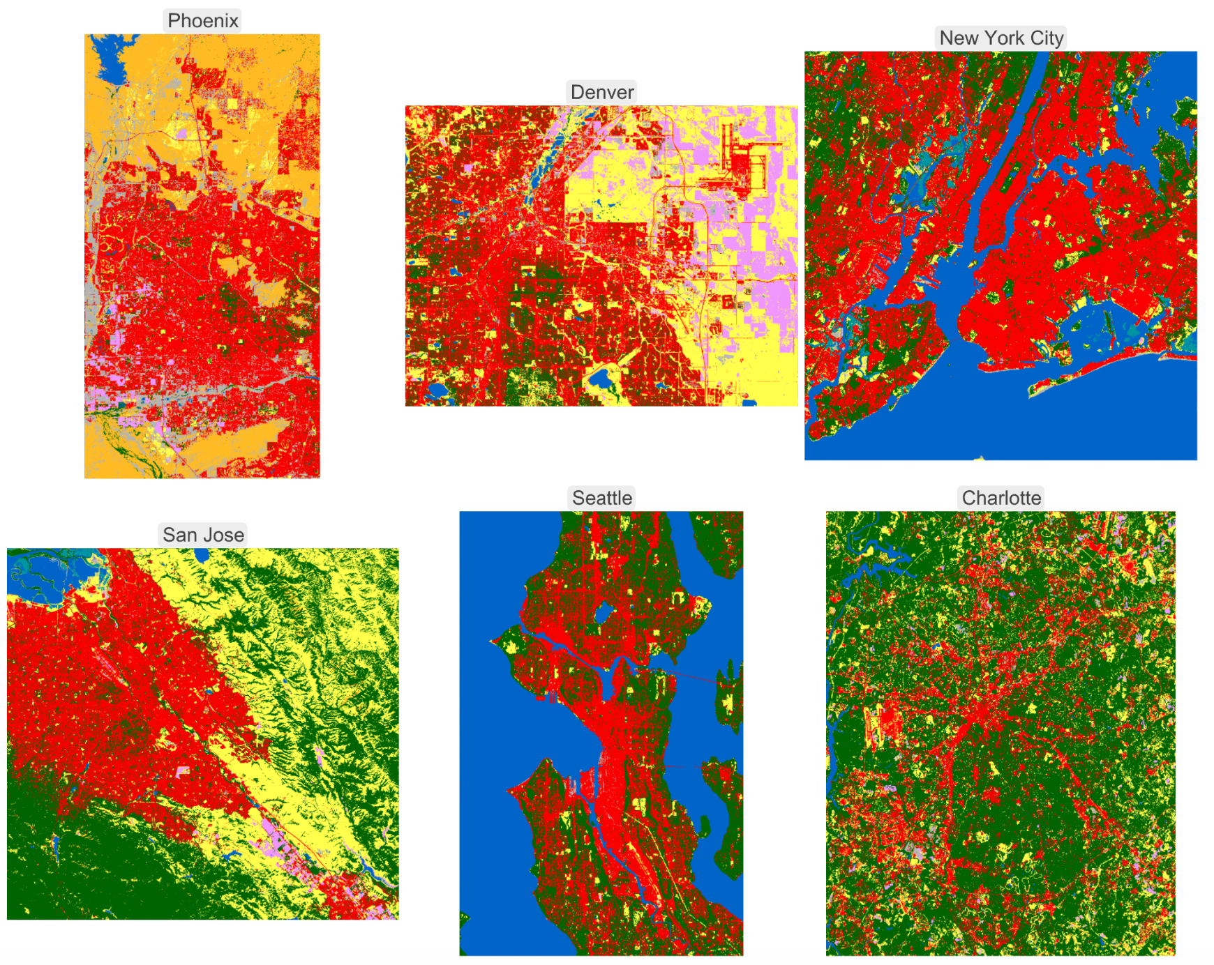 Plotting the ESA land cover for these cities yields important morphological visual contrasts. For example, Phoenix and Denver exemplify contiguous expansion into open terrain and are surrounded by arid shrubland and high plains grassland, respectively. In contrast, New York, San Jose and Seattle have sharp boundaries where development is strictly confined by valley topography or water bodies, and in Charlotte the built environment is heavily interspersed with dense tree canopy.