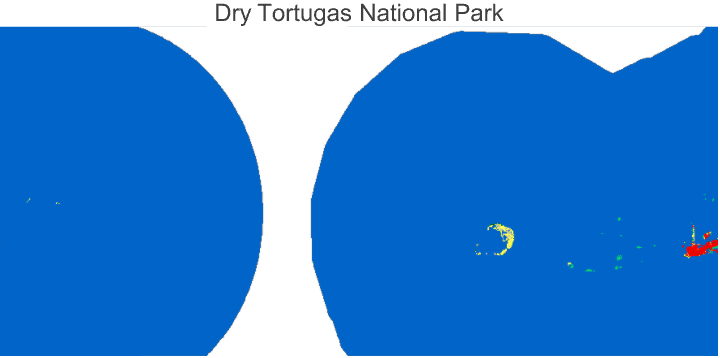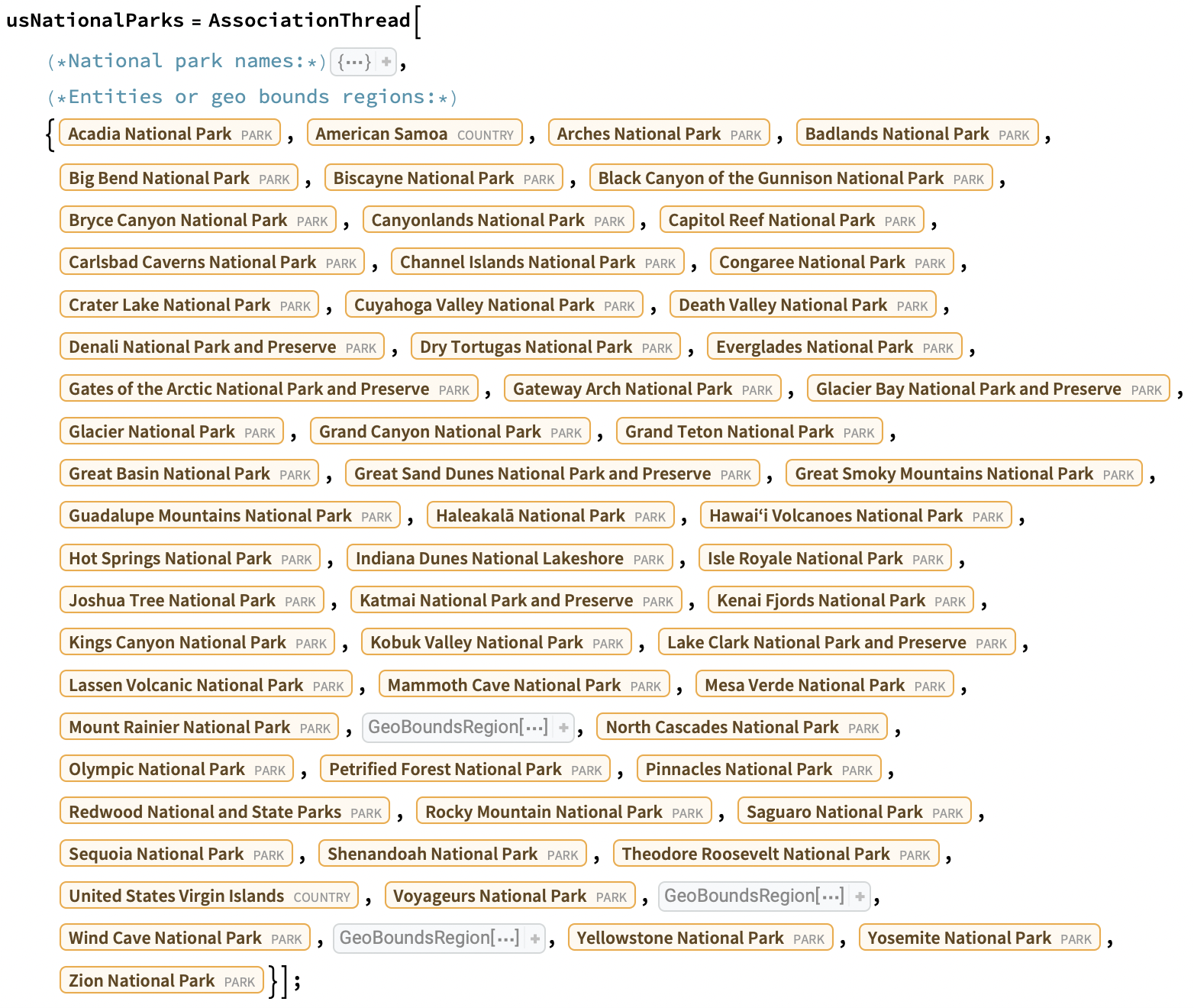 Let's also try this for US national parks. In the last example, we used entities from the Wolfram Knowledgebase to define the geographic footprints of US cities to be plotted. We'll need to to something similar for national but since the knowledgebase does not have built-in entities for every park yet, we'll have to supplement the list with some custom-defined regions as well.