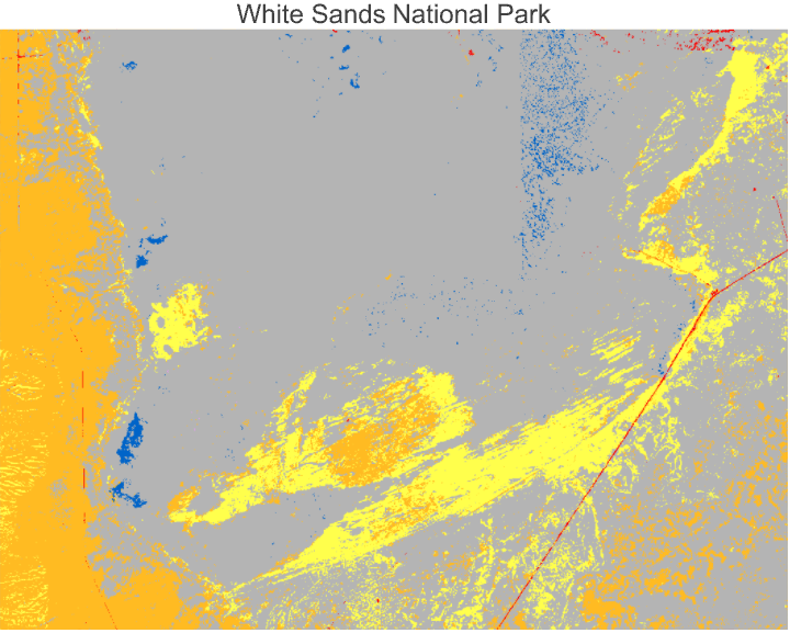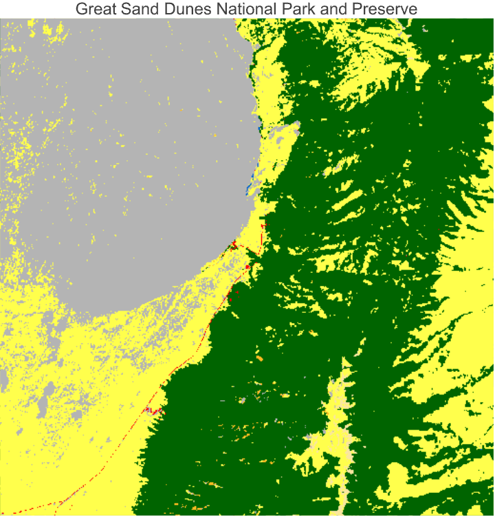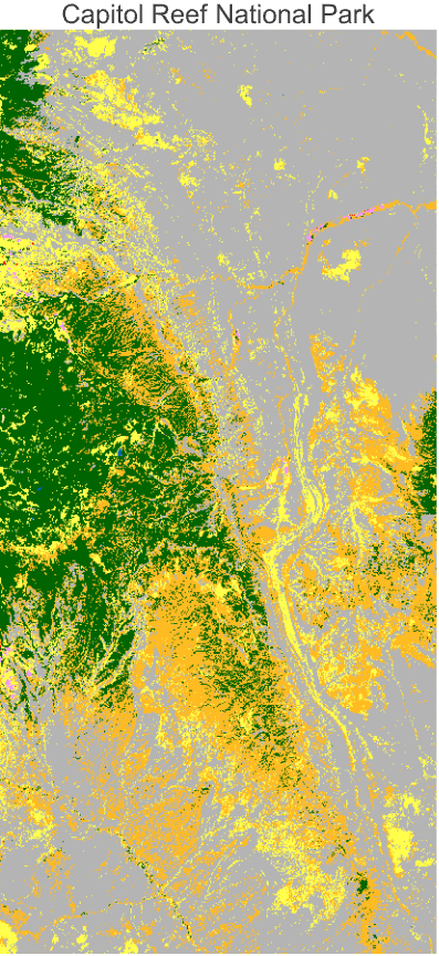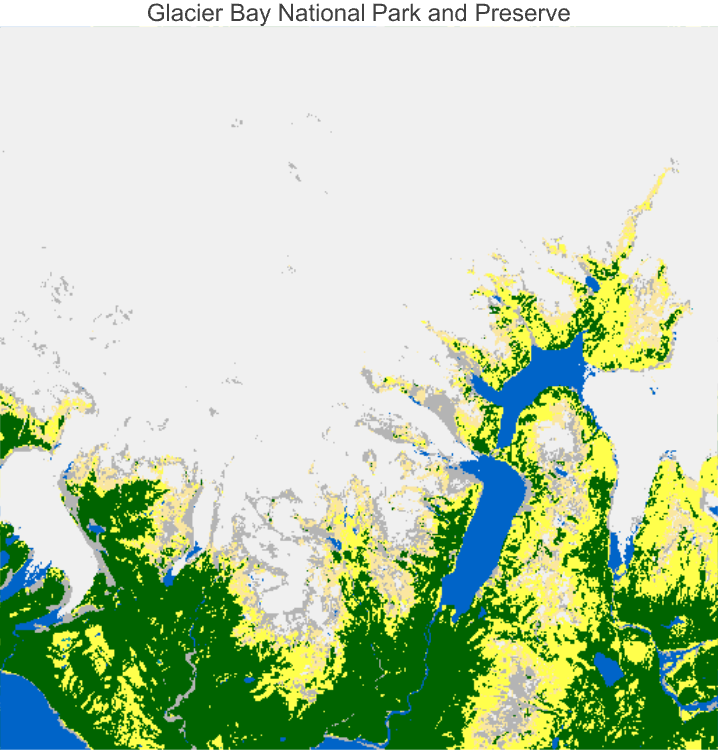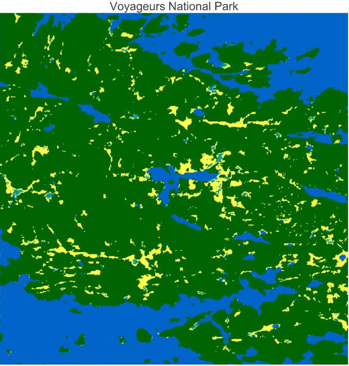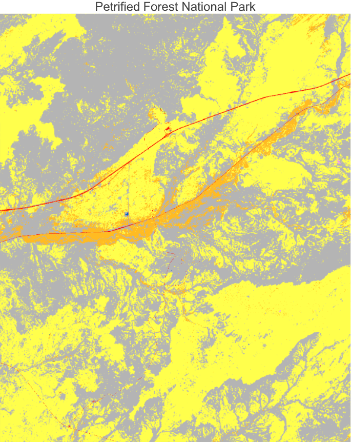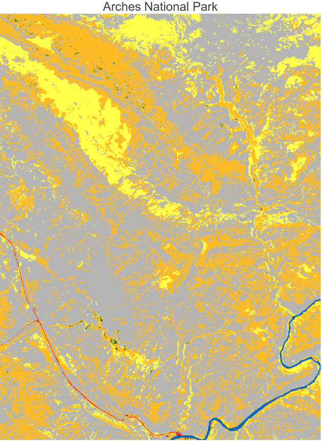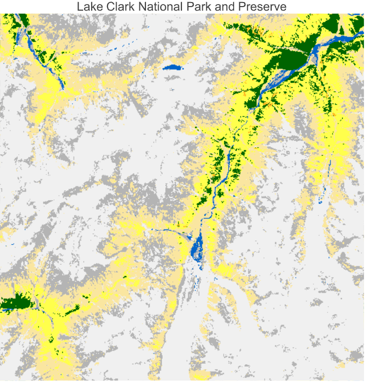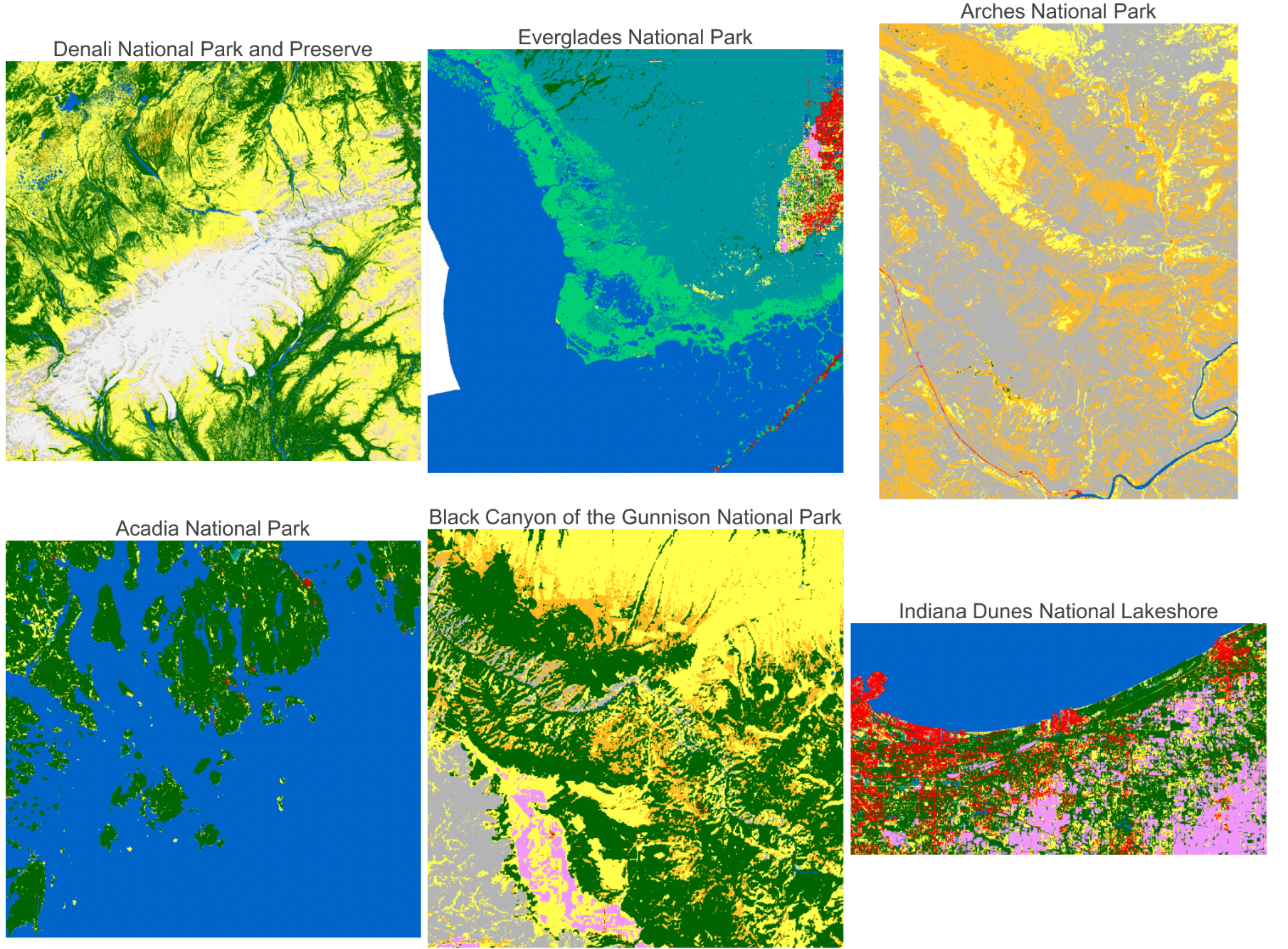 Applying this workflow again to US National Parks, there are important contrasts in the landscape compositions. For instance, Denali and the Everglades have unique dominant cover types: permanent snow and grassland, and herbaceous wetland and mangroves, respectively, that stand apart from the arid shrubland and bare rock of Arches. Other contrasts are defined by topography and hydrography, such as the fragmented coastal forests of Acadia or the steep gradients of the Black Canyon. An outlier, Indiana Dunes is sharply bounded by adjacent urban and agricultural land.