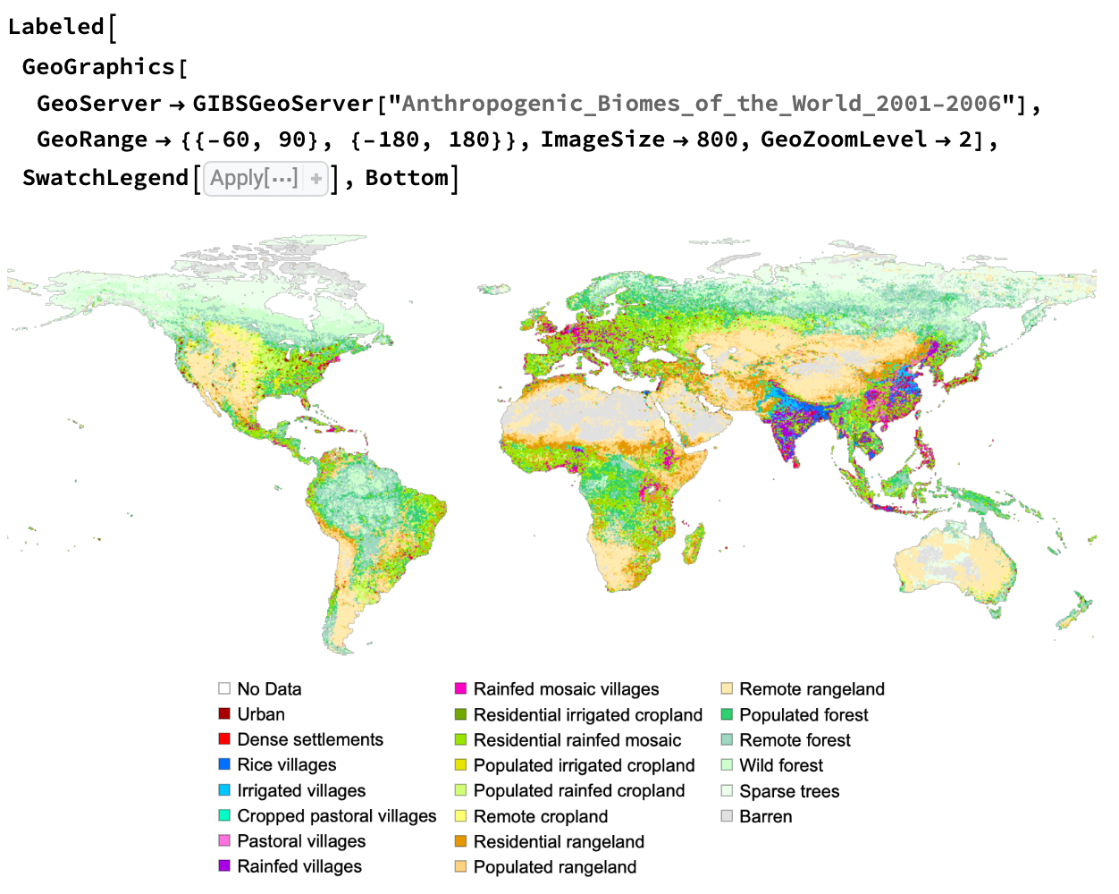 The anthropogenic biomes dataset puts human activity at the center of ecological classification, and that makes it an especially compelling tool to study the Anthropocene. It's also conveniently available through NASA GIBS via the RemoteSensing paclet, among over a thousand other remote sensing datasets. Here's how you can install and use this tool yourself: