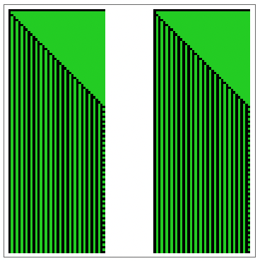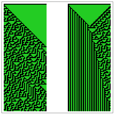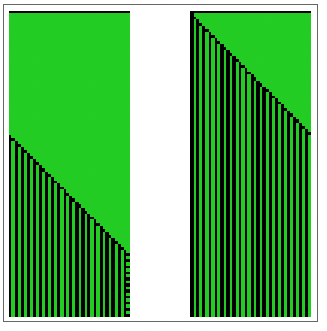 Now, on the left and right sides of the state array, the background is effectively taken to be all zeros, so the rightmost cascade can never wrap around to the left, and the simulation space is fixed. In this specific case, the change also causes both green regions to start with the same initial conditions. As the neighbours to the left of the leftmost cell of each green region at t=0 are now considered to be zero, the initial conditions cause two cascades instead of one.