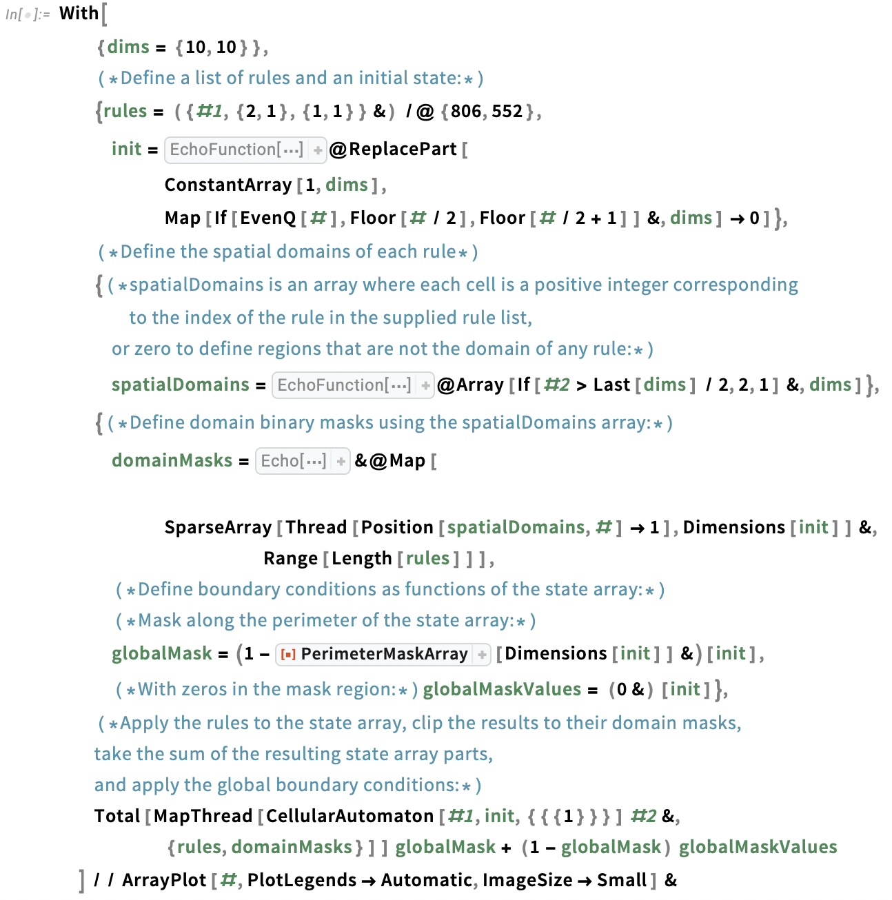 This next code snippet demonstrates the process I settled on in my final implementation to compute a single Coexisting CA simulation step. I've included comments to describe the process alongside the code, and calls to Echo and EchoFunction to show key variables generated or used in the throughout its execution.