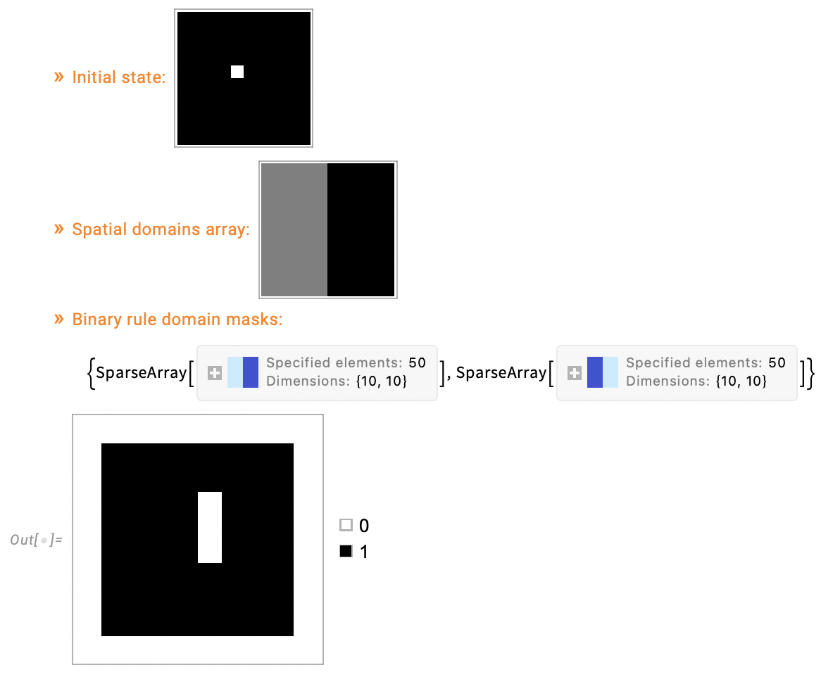 - Apply the CA rules to their respective domains, clip the results to the domain masks, sum the resulting state arrays, and apply the global boundary conditions.