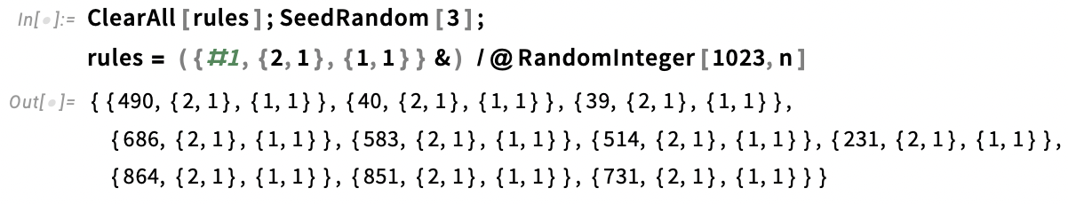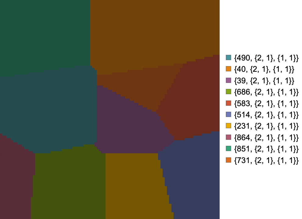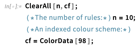 I'll start by defining my simulation parameters. For this example, I'll pick 10 rules at random. Each rule domain will be assigned its own colour.