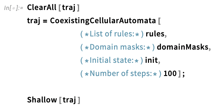 We can use the tools developed above to perform simulations in which several CA rules operate in parallel on non-overlapping regions of the simulation space. I'll refer to simulations like these as Coexisting CAs, and since I'm going to want to experiment with Coexisting CAs a lot, I'll define a CoexistingCellularAutomata function to automate the process of setting up and running these simulations. The full function definition can be found in the Code Initialisation section at the end of the Wolfram Community version of this article.