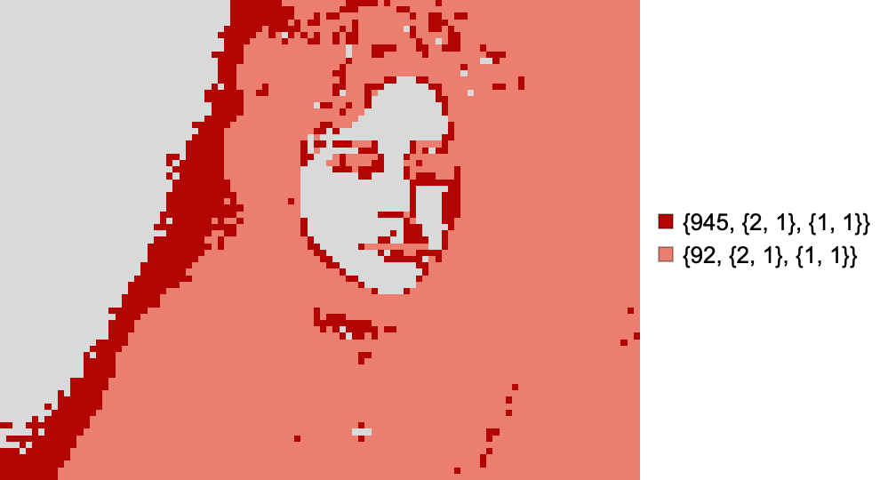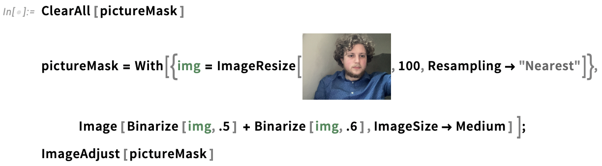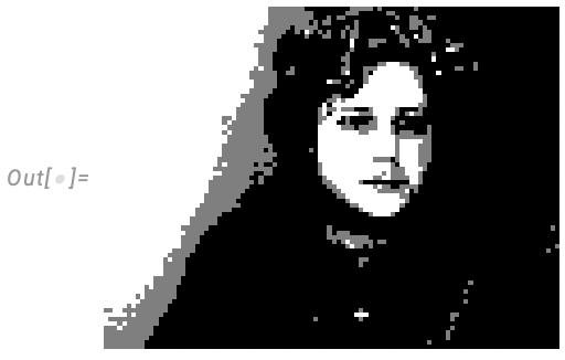 For this next example, I posterized a webcam selfie so as to only have pixel values of 0,1, or 2 and used the resulting image as the domain mask specification in CoexistingCellularAutomata. In the simulation, these values respectively correspond to neutral territory, the domain of the first rule, and the domain of the second rule. I picked two totalistic 9-neighbour 2D CA rules to use at random: