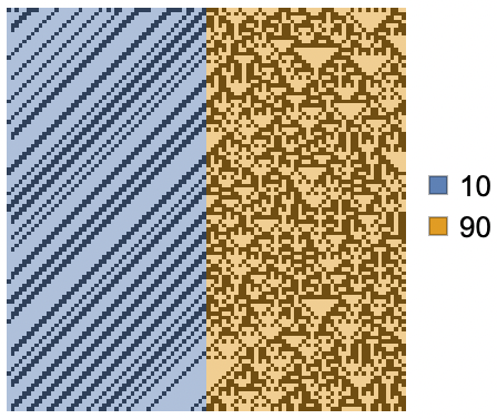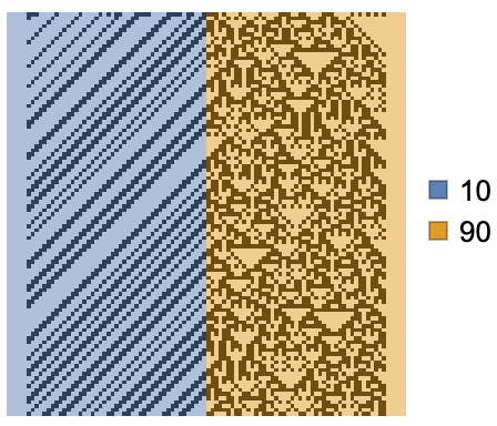 By default, CoexistingCellularAutomata assumes periodic boundary conditions on the simulation space, as in this trajectory of rule 10 and rule 90, where the leftmost cells of the array interact with the rightmost cells: