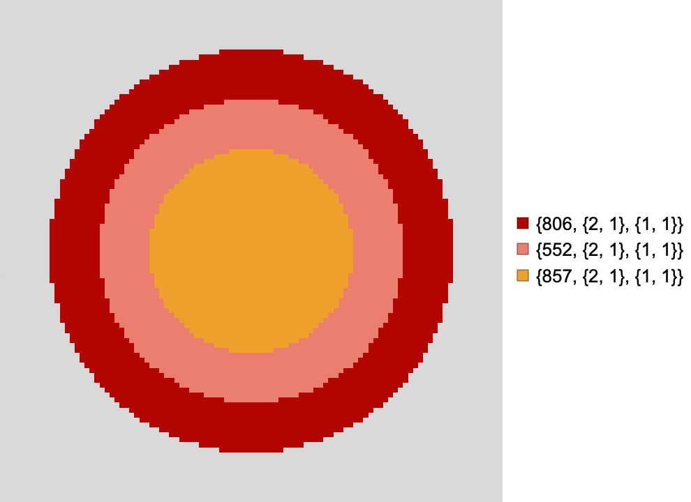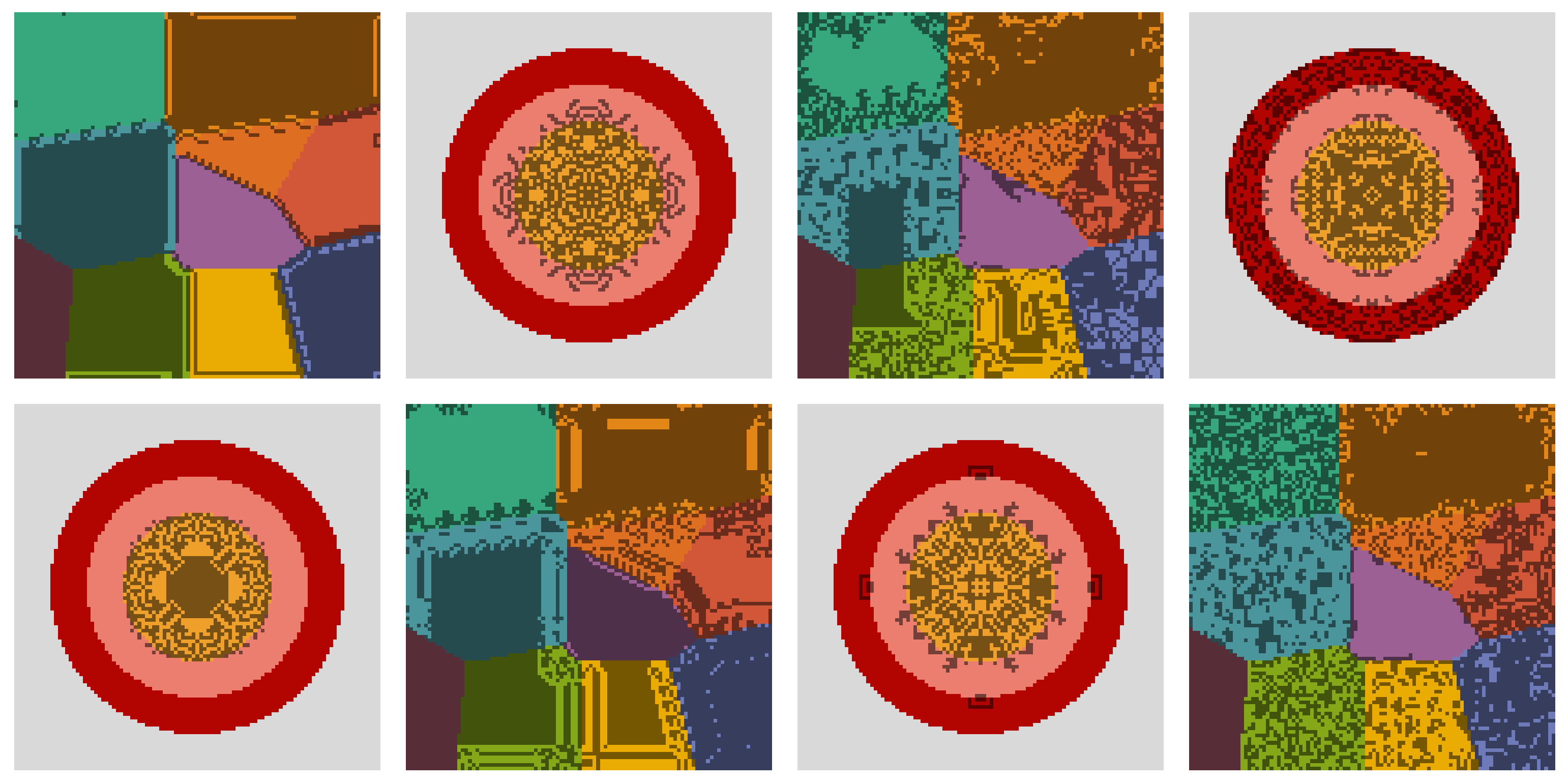 - Create an array that specifies the spatial domain for each CA rule, where each cell in the array corresponds to the index of the rule that should be applied in that region.